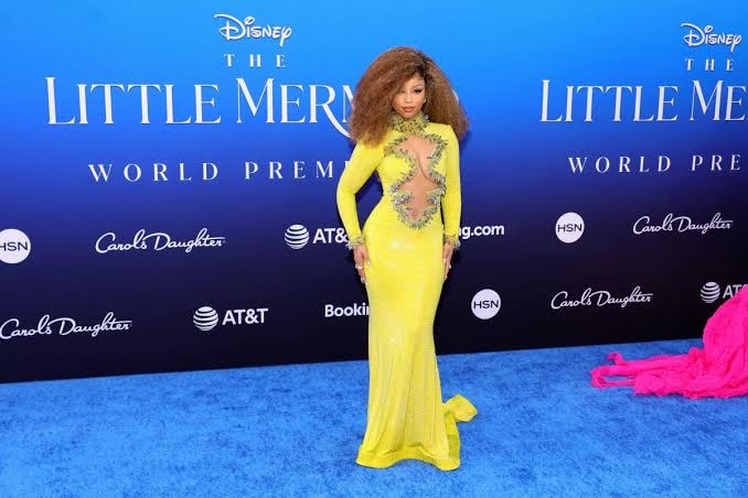 Halle Bailey’s superstar sister, Chloe Bailey had to dress to the nines to support her baby sister, who was the star of the show, and she did. She was dressed in a yellow “Following The Sun” gown by Gert-Johan Coetzee.